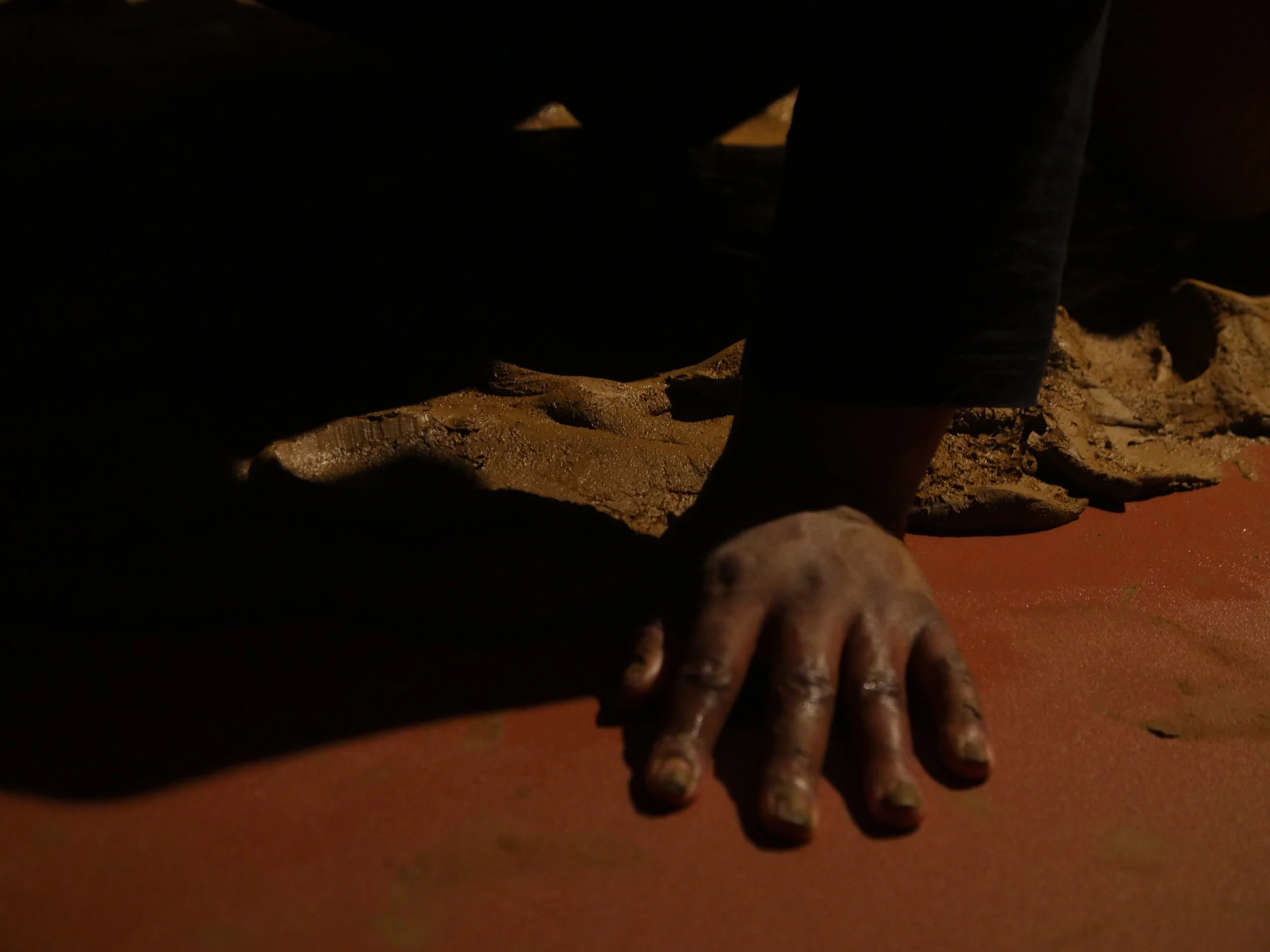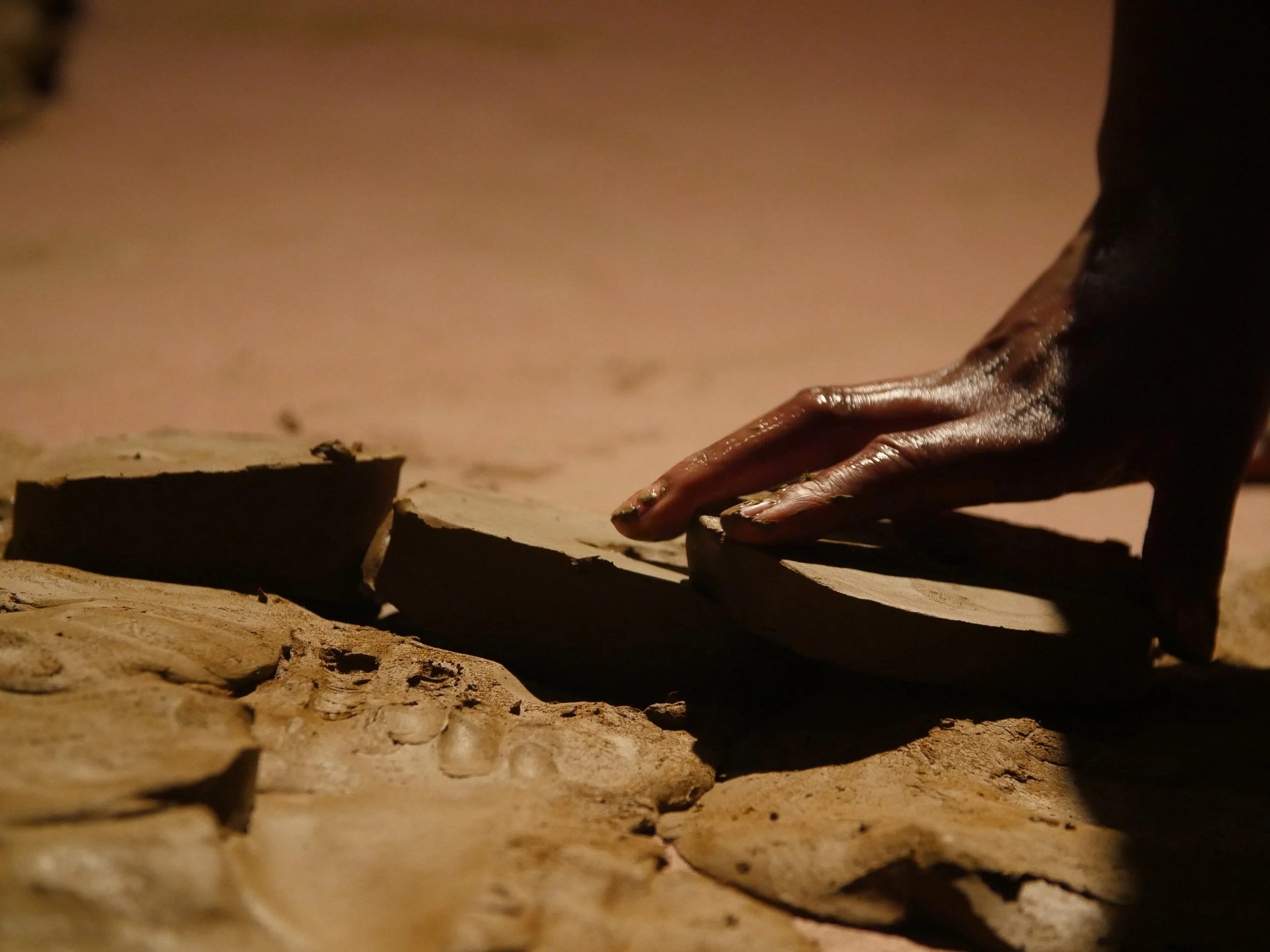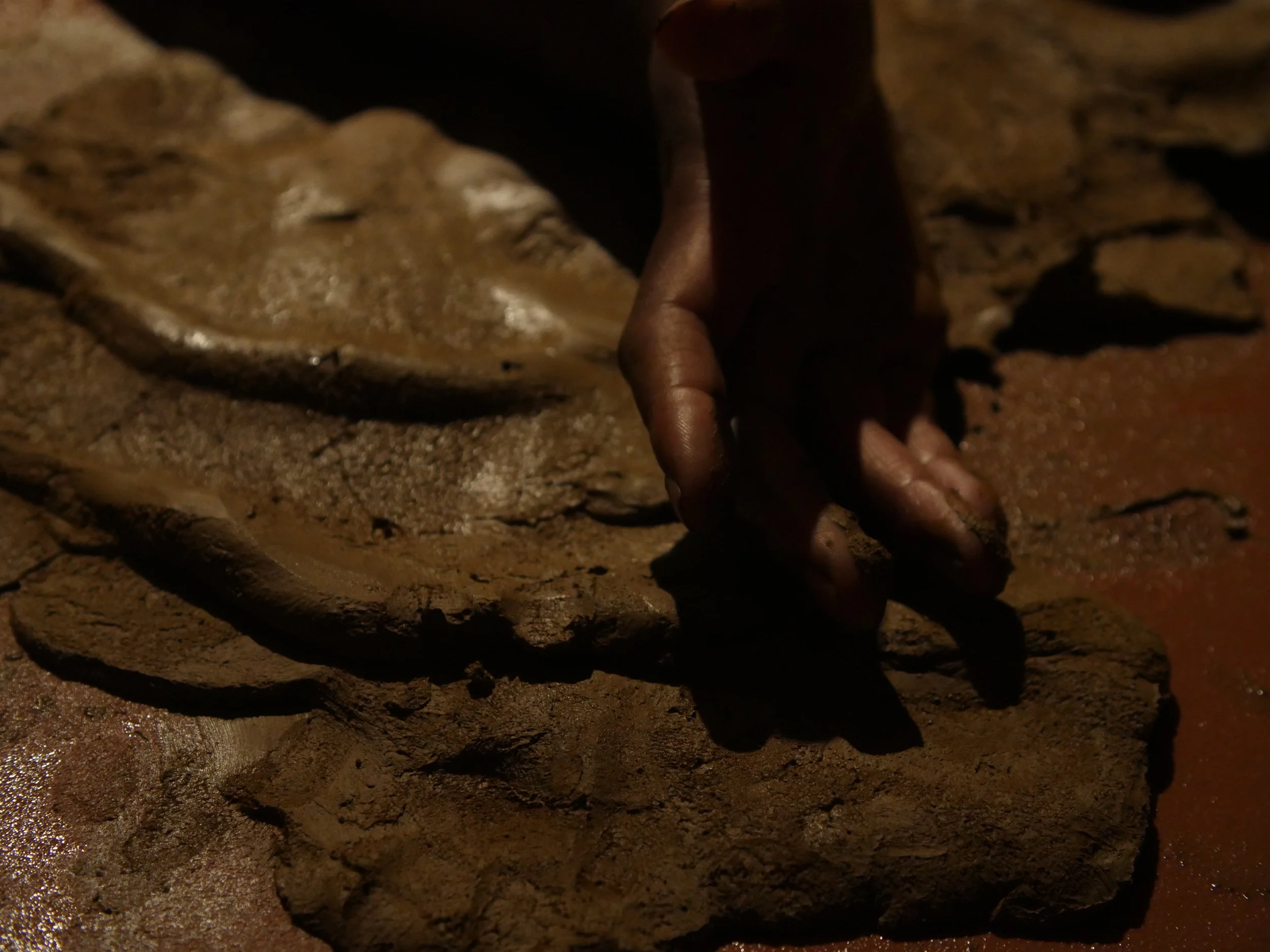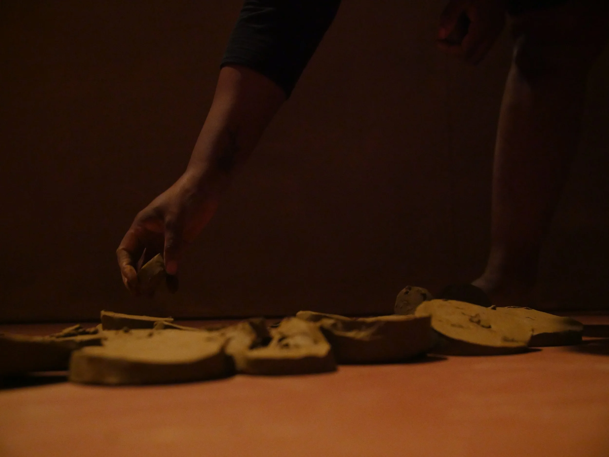 Formed through a series of solitary performances, ‘softening inherited knots’ is a durational, site-specific installations developed between my body and clay, tracing an embodied practices of uncovering how racial trauma is held and felt within the physical, spiritual, and ancestral body. Holding trace impressions of my body, the sculptural works made from raw London clay gathered from a local cemetery become sites/earthworks of ‘blackened knowledge’, forming a relational partnership between body and clay as the corporeal body of the earth. Adding to the earthworks throughout the duration of the exhibition, I returned to the installation as a continual practice of engagement between clay, breath, and the body. Through engaging with clay during its varied states of malleability and engaging the body through states of embodied breath and somatic practices, the earthworks conjure an intimate relationship between body and clay as co-collaborators in the active undoing of racial trauma, and conduits to intimate practices of grief-work and healing modalities.