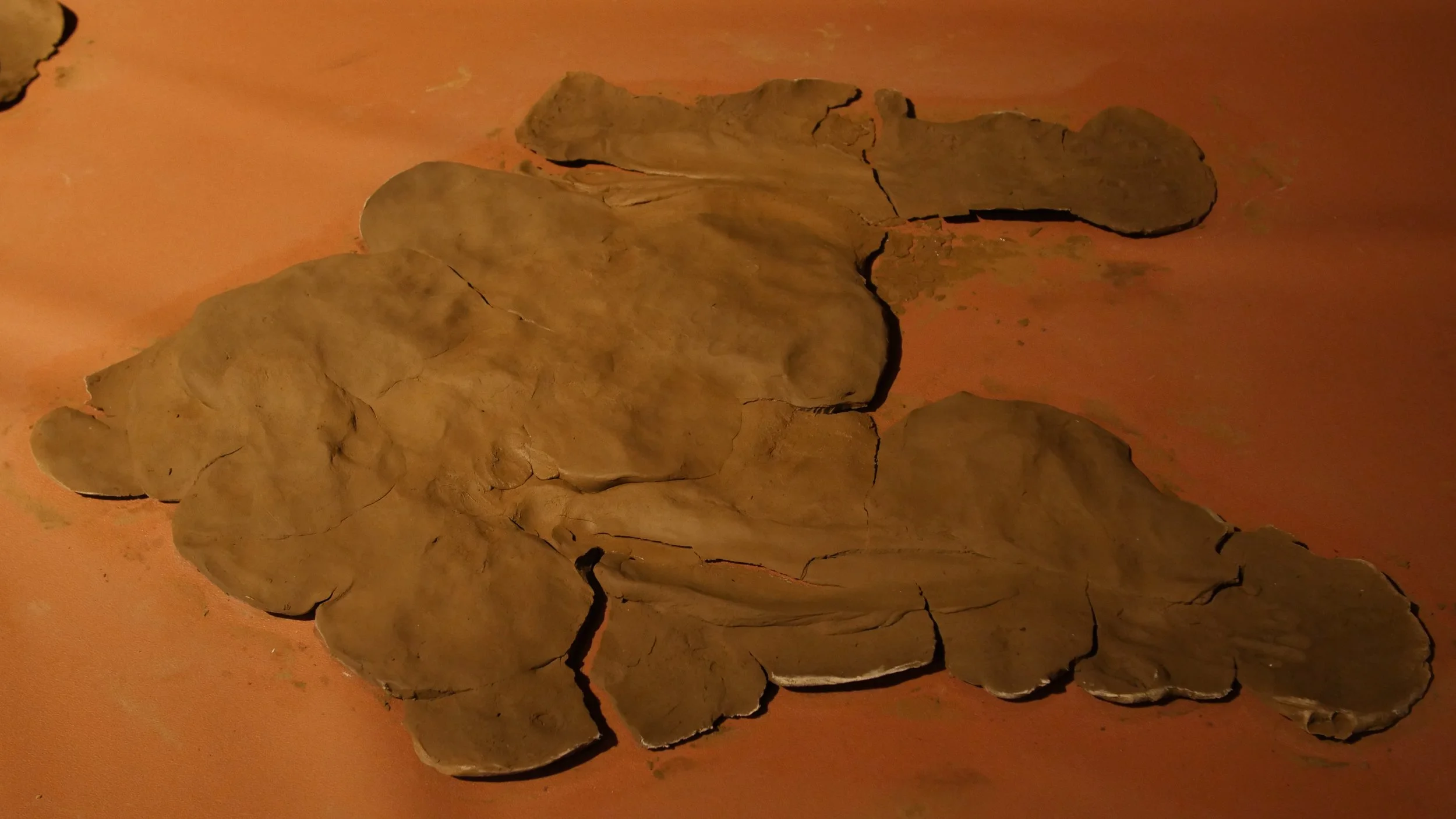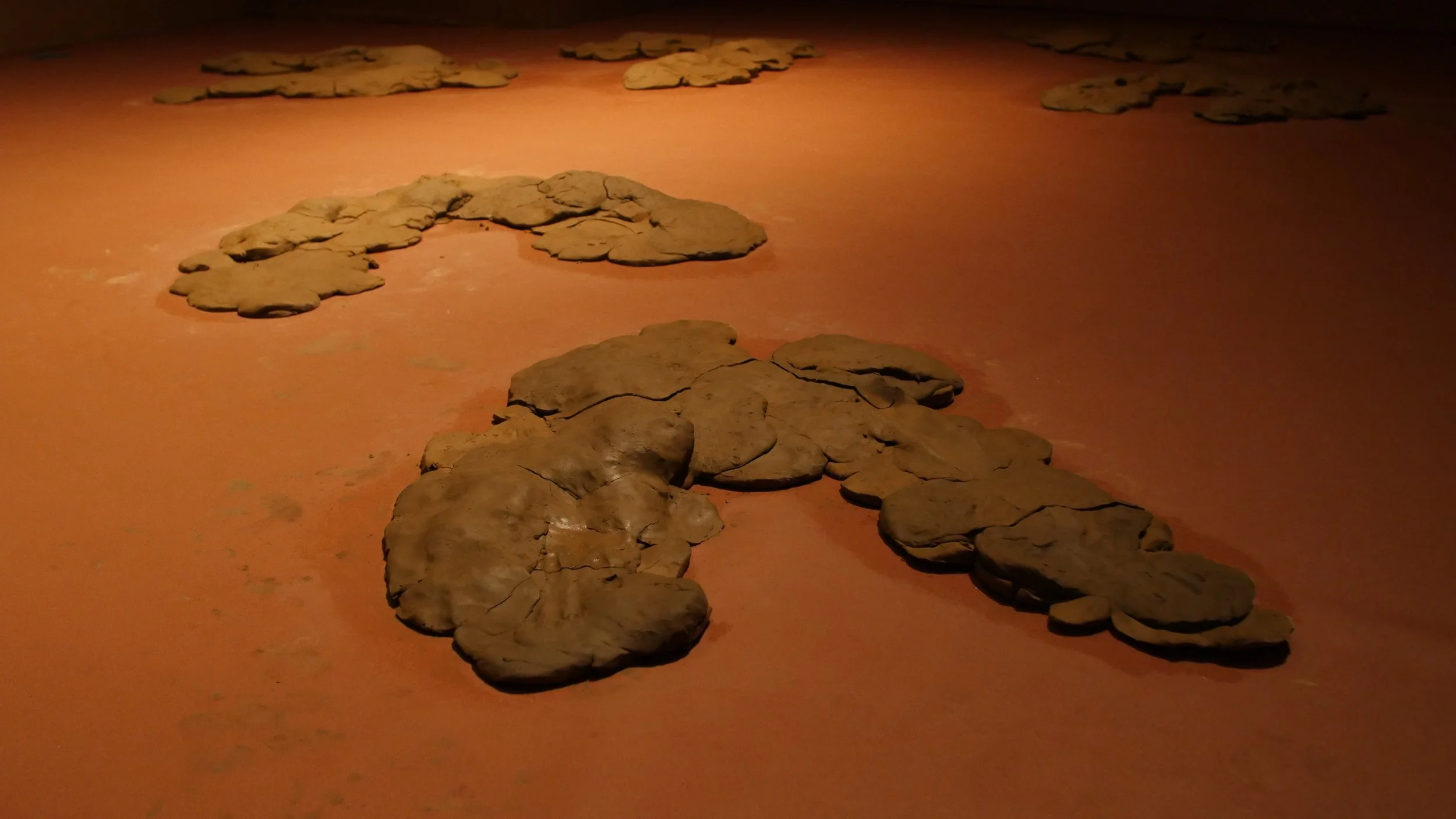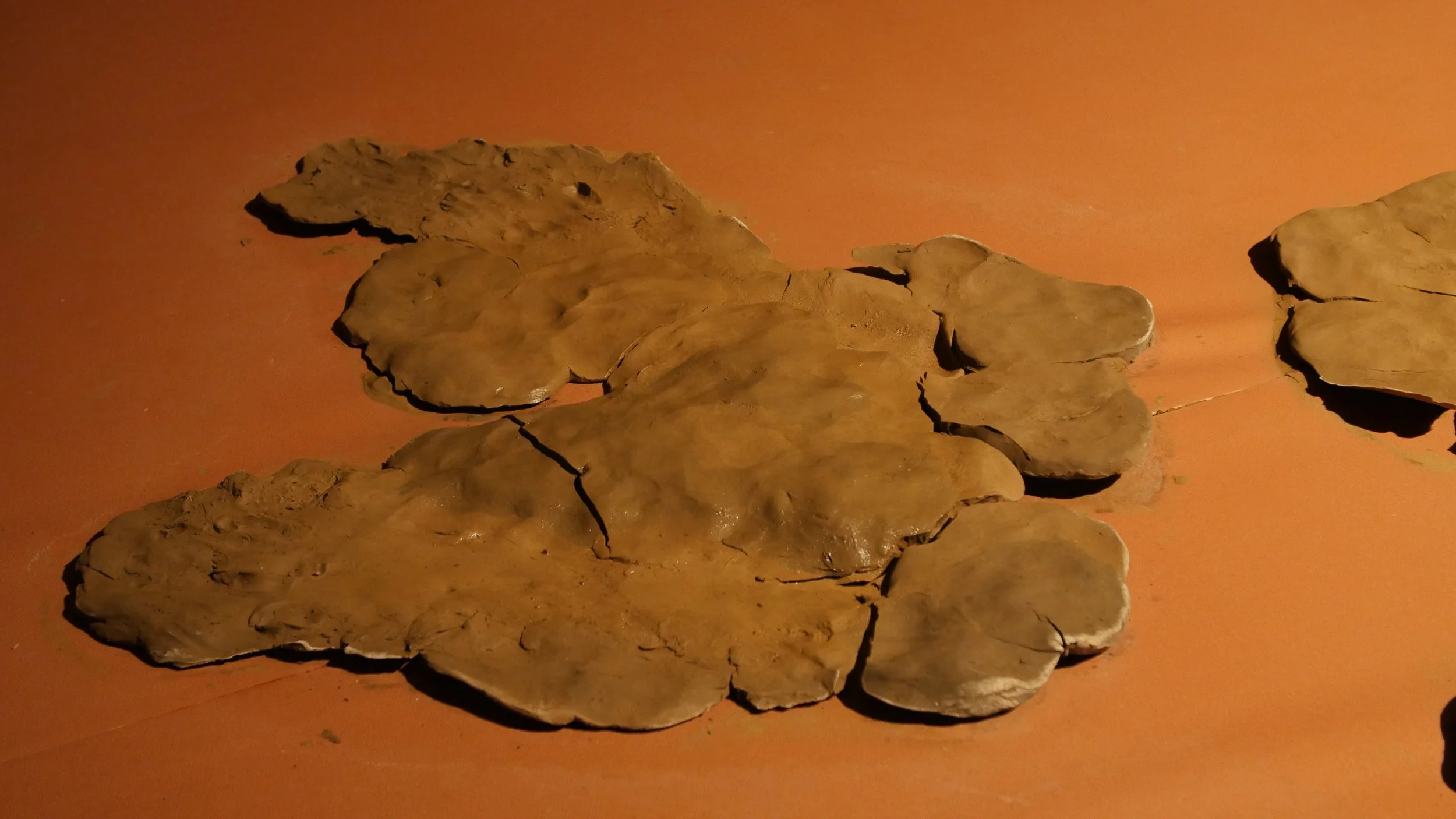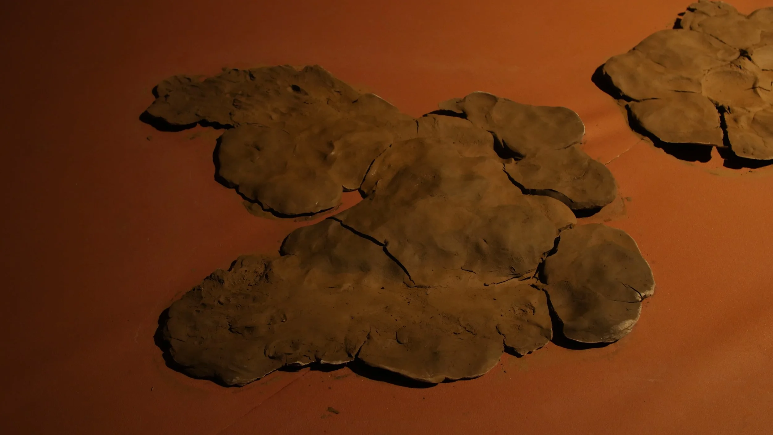 Formed through a series of solitary performances, ‘softening inherited knots’ is a durational, site-specific installations developed between my body and clay, tracing an embodied practices of uncovering how racial trauma is held and felt within the physical, spiritual, and ancestral body. Holding trace impressions of my body, the sculptural works made from raw London clay gathered from a local cemetery become sites/earthworks of ‘blackened knowledge’, forming a relational partnership between body and clay as the corporeal body of the earth. Adding to the earthworks throughout the duration of the exhibition, I returned to the installation as a continual practice of engagement between clay, breath, and the body. Through engaging with clay during its varied states of malleability and engaging the body through states of embodied breath and somatic practices, the earthworks conjure an intimate relationship between body and clay as co-collaborators in the active undoing of racial trauma, and conduits to intimate practices of grief-work and healing modalities.