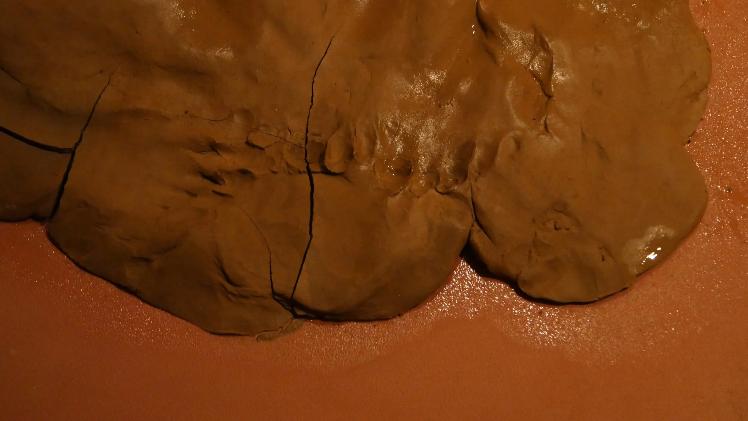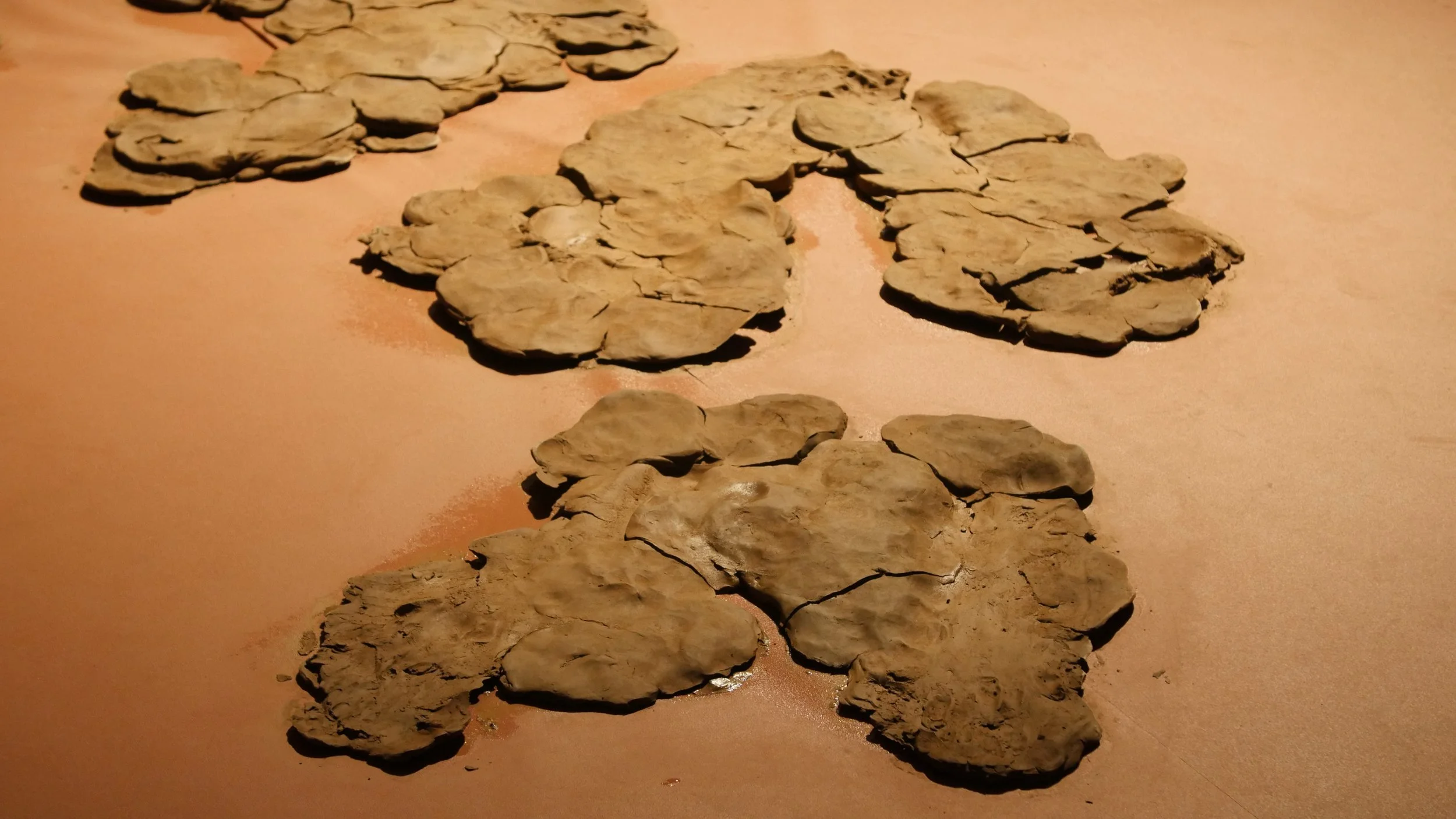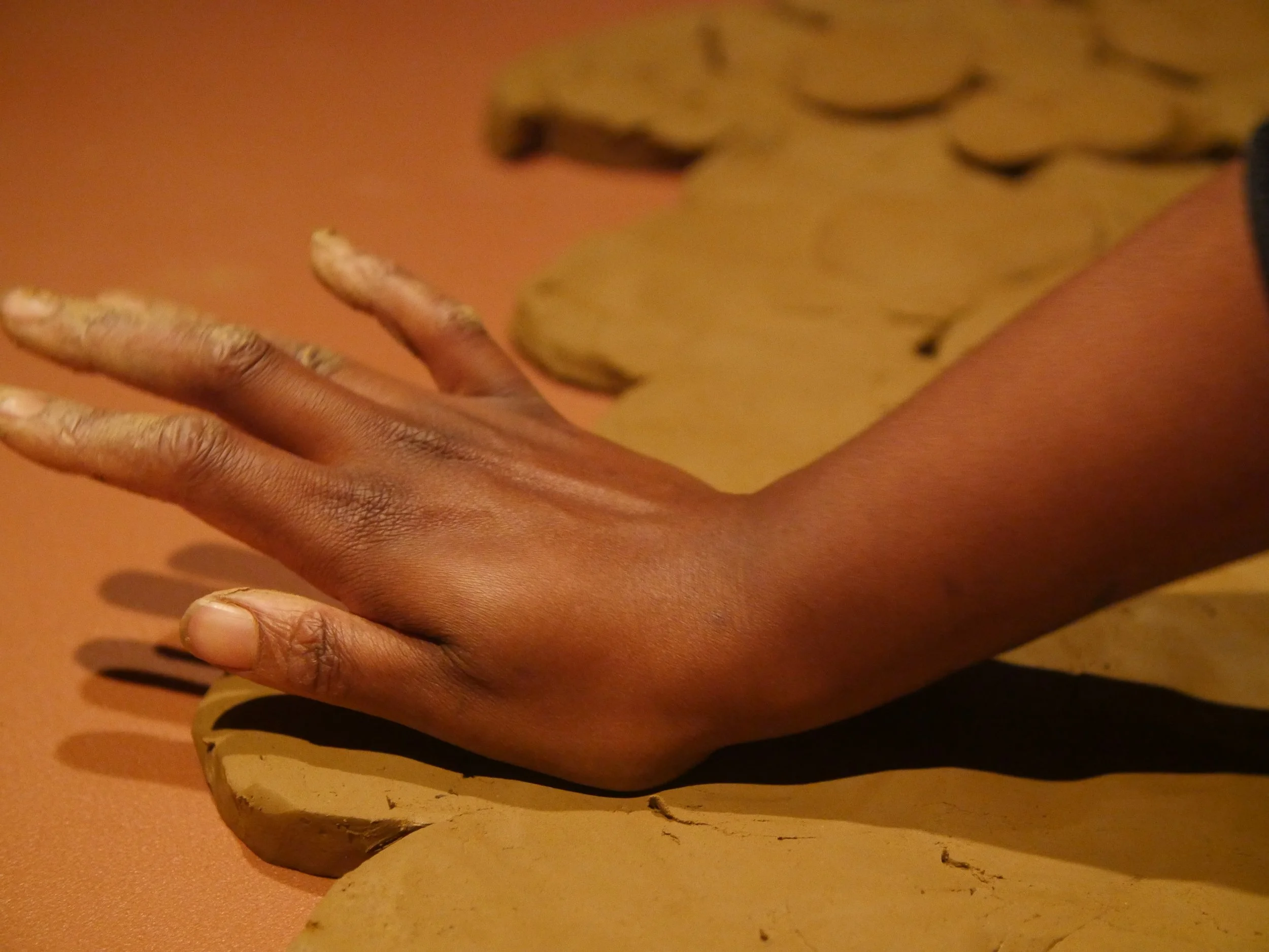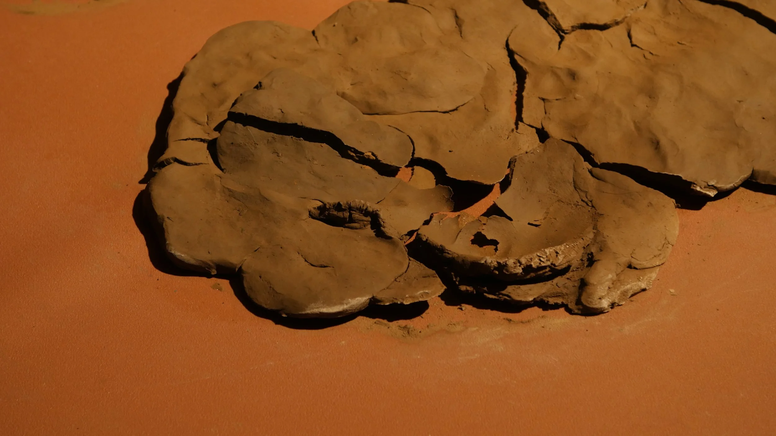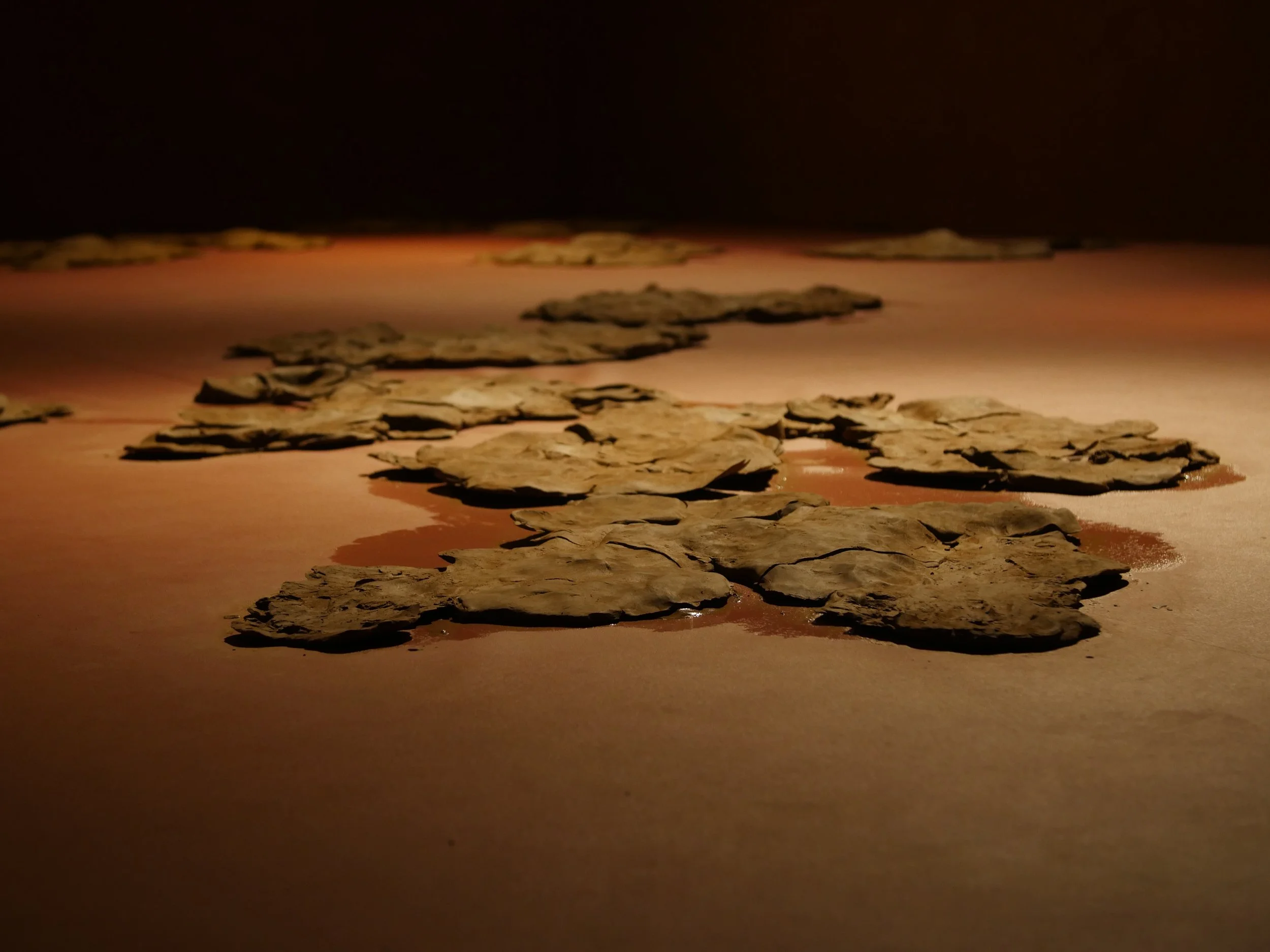 Formed through a series of solitary performances, ‘softening inherited knots’ is a durational, site-specific installations developed between my body and clay, tracing an embodied practices of uncovering how racial trauma is held and felt within the physical, spiritual, and ancestral body. Holding trace impressions of my body, the sculptural works made from raw London clay gathered from a local cemetery become sites/earthworks of ‘blackened knowledge’, forming a relational partnership between body and clay as the corporeal body of the earth. Adding to the earthworks throughout the duration of the exhibition, I returned to the installation as a continual practice of engagement between clay, breath, and the body. Through engaging with clay during its varied states of malleability and engaging the body through states of embodied breath and somatic practices, the earthworks conjure an intimate relationship between body and clay as co-collaborators in the active undoing of racial trauma, and conduits to intimate practices of grief-work and healing modalities.